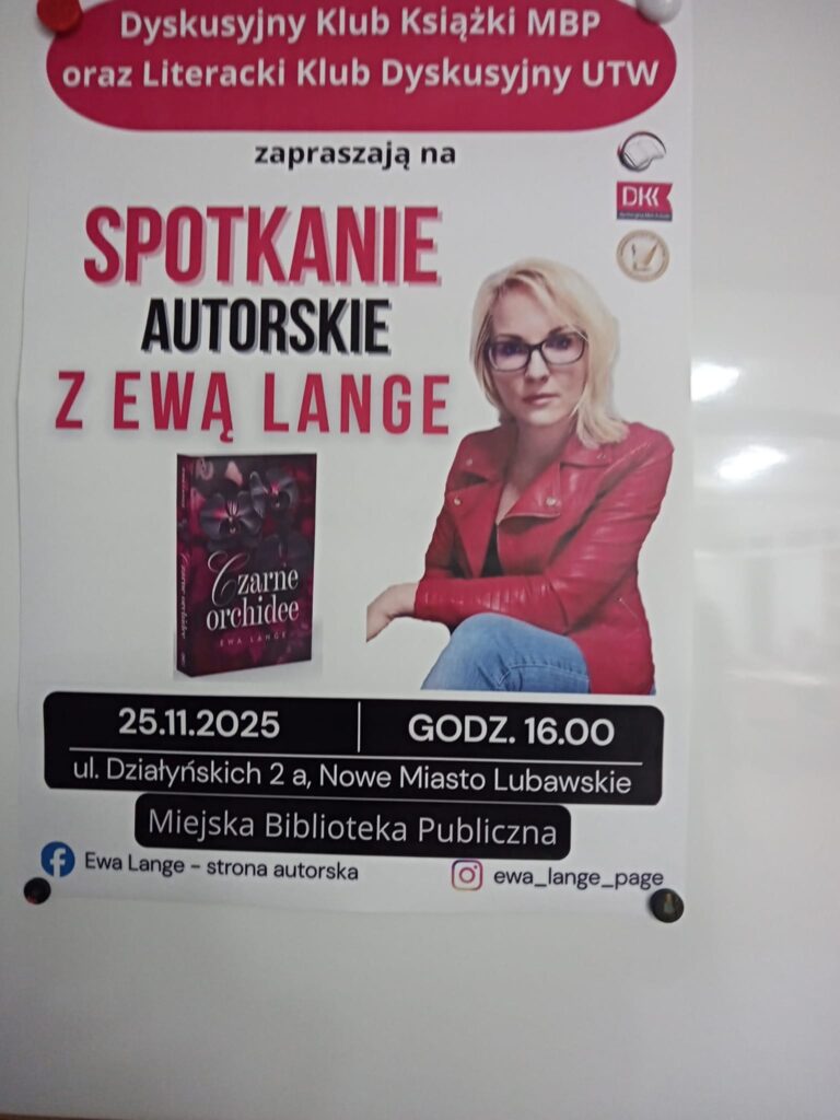 W dniu 25.11.2025r. w Miejskiej Bibliotece Publicznej odbyło się spotkanie autorskie z Ewą Lange, autorką książki „ Czarne orchidee” zorganizowane przez Dyskusyjny Klub Książki MBP z udziałem Literackiego Klubu Dyskusyjnego UTW. „Czarne orchidee” to debiut literacki autorki, bardzo interesujący, ciepło przyjęty przez czytelników. To opowieść o miłości i nienawiści, o traumach przekazywanych z pokolenia na pokolenie, o tragicznej przeszłości i trudnej teraźniejszości.